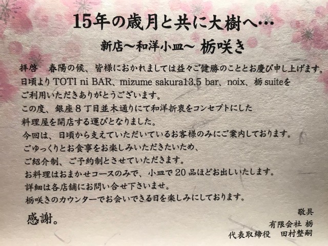 TOTI ni BAR (トチ・バー) 東京都中央区銀座8-5-19 園枝ビル B2F ご予約・お問い合わせ お電話:03-6215-8820 メール:お問い合わせフォーム